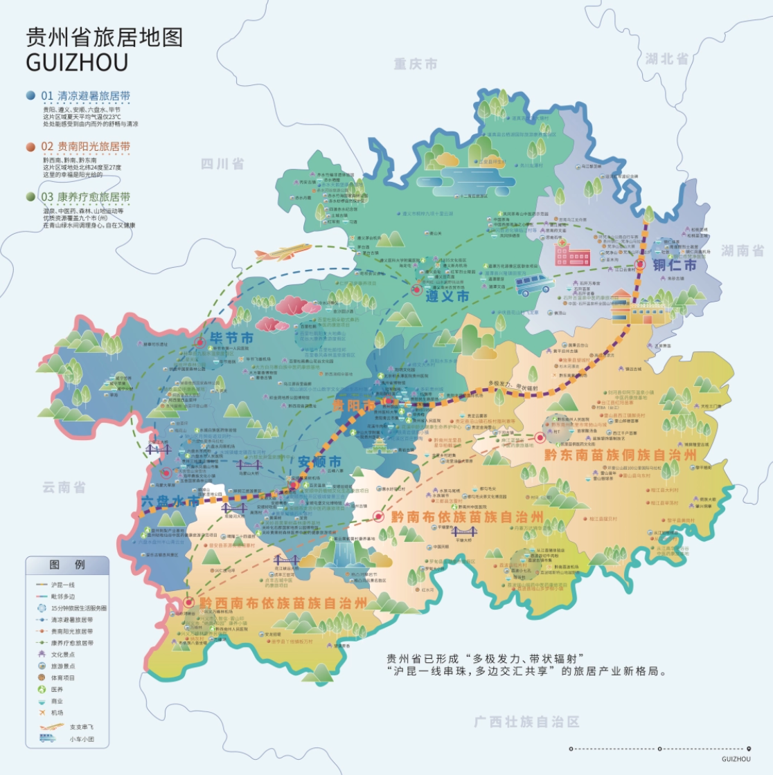 这张旅居舆图,既是畅游贵州的“出行指南”,亦然投资贵州旅居产业的“协作舆图”。该舆图将贵州分为凉爽避暑旅居带、贵南阳光旅居带、康养疗愈旅居带三个部分。其中,凉爽避暑旅居带含贵阳、遵义、安顺、六盘水、毕节5地,OD体育app这片区域夏天平均气温仅23摄氏度,处处能感受到由内而外的满足与凉爽。贵南阳光旅居带含黔西南、黔南、黔东南,这片区域地处北纬24度至27度,开云体育阳光充沛。康养疗愈旅居带以温泉、中医药、丛林、平地说明为脾气,优质资源掩盖全省九个市(州),让旅居者在青山绿水间保重身心。