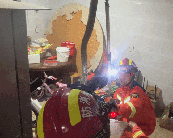 消防员郑鑫雷绽放杂物间的门,里头灯开着,十几浅显米的面积,堆放着圆台面、方桌,以及儿童自行车等物品。