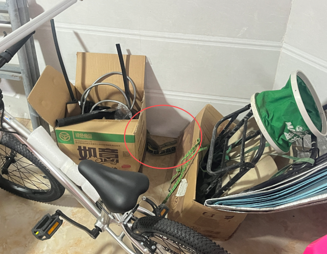 房门正对面的边际有一堆纸箱。定睛一看,好家伙,两条蛇尾巴露在外面,颜料还不一样!