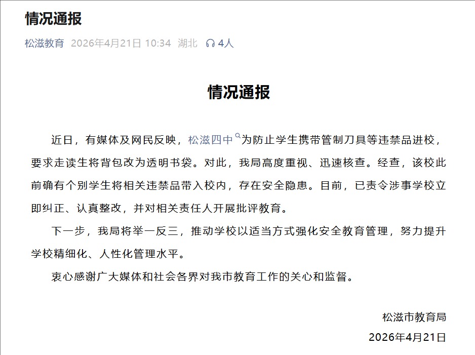 kaiyun官方登录入口 湖北松滋市解说局通报“某学校条件走读生将背包改为透明书袋”:已责令涉事学校立即校正、风雅整改