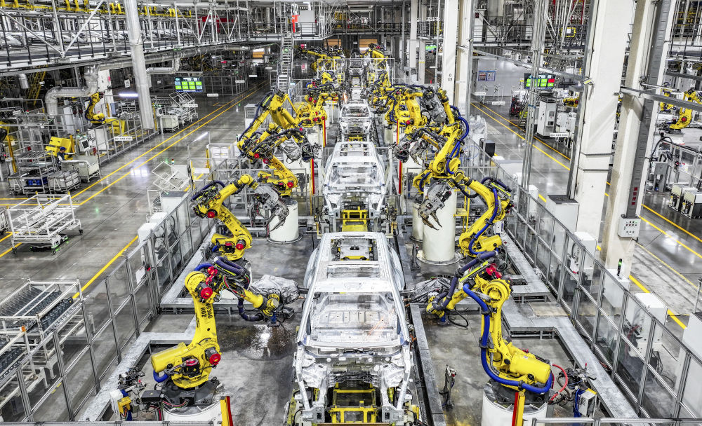 在位于重庆市两江新区的赛力斯汽车超等工场拍摄的自动化分娩功课现场(2025年9月19日摄)。新华社记者 王全超 摄