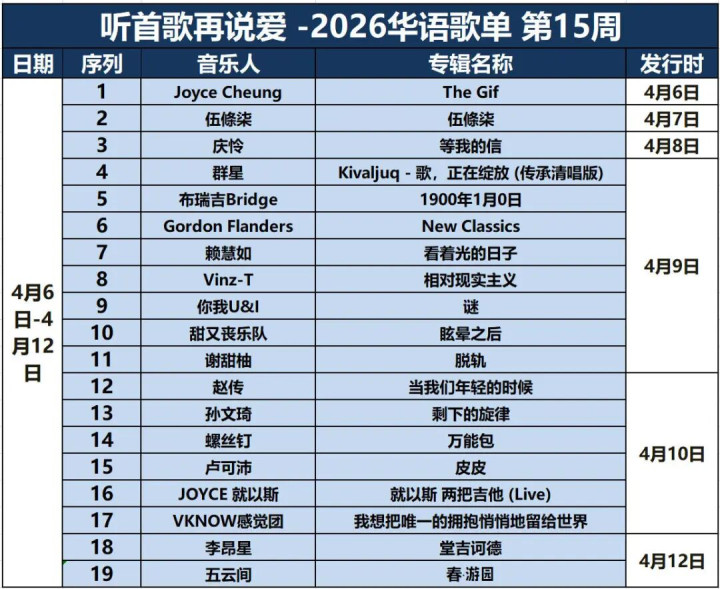 2026年第15周(4月6日-4月12日),本周天然欠缺分量级音乐东说念主压阵,然而百花都放,各式格调都有代表性作品。